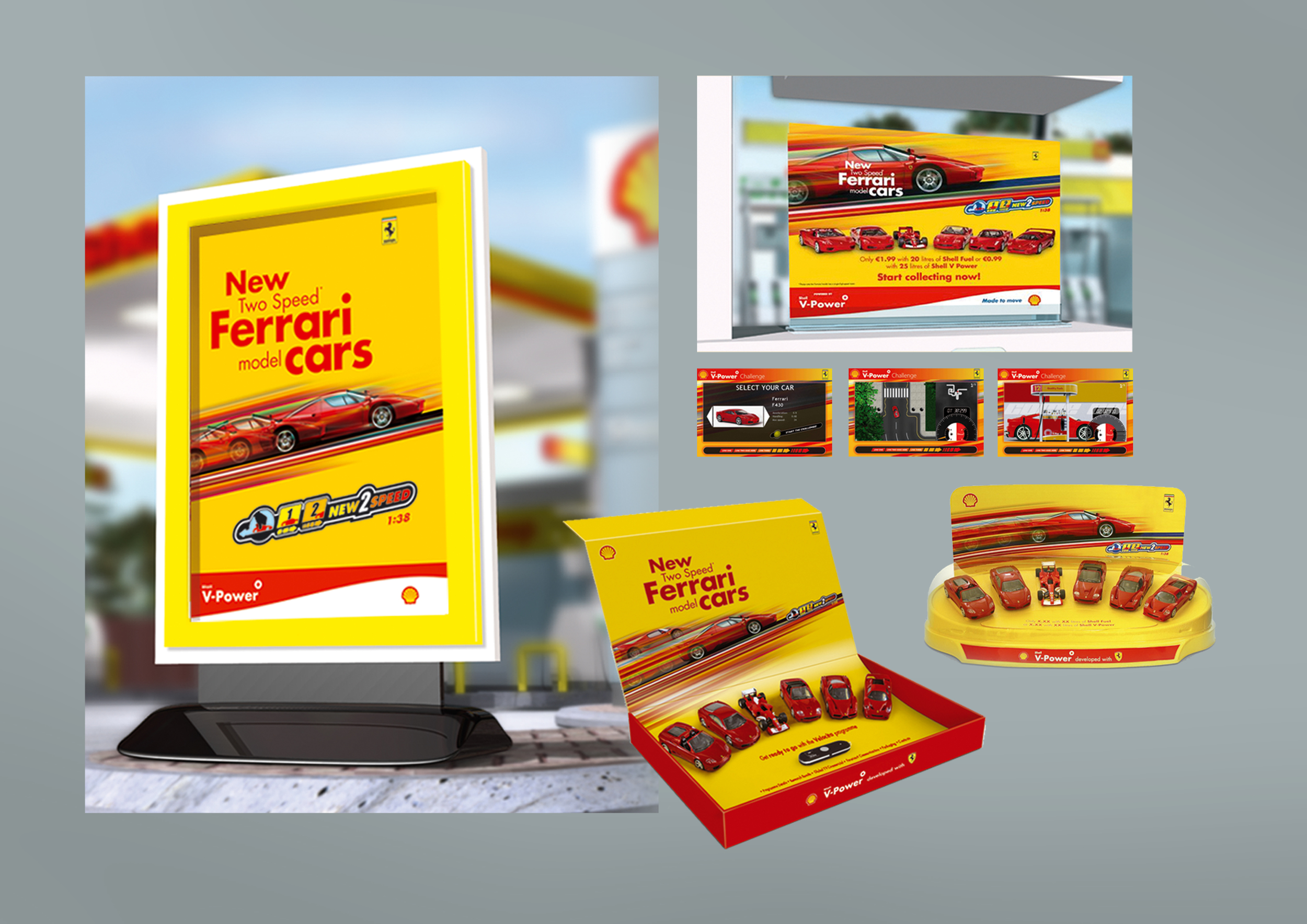 This was Shell’s most successful global promotion ever. When the product designers we worked with invented the ‘two speed, pull-back friction motor’ we immediately saw a parallel with the power boost engines receive when running on Shell V-Power. To help demonstrate this, and leverage Shell’s partnership with Ferrari, we created a range of scale model cars fitted with the motor. The cars were sold in every market in the world with the purchase of